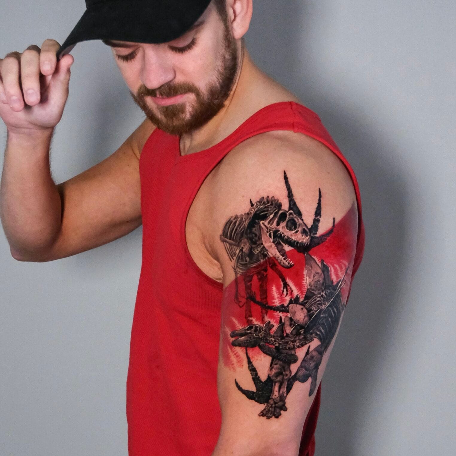 A mix of styles, this shoulder tattoo showcases dinosaur skeletons in a realistic design, complemented by a bold red abstract background. The vibrant red adds an energetic touch to the detailed skeletons and makes it a total fit for Trash Polka style lovers.